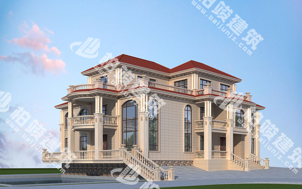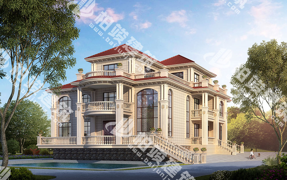外墙装饰:多层花瓶型护栏,搭配简约罗马柱、欧式花盆、浮雕,繁简相间,视觉效果丰富不杂糅