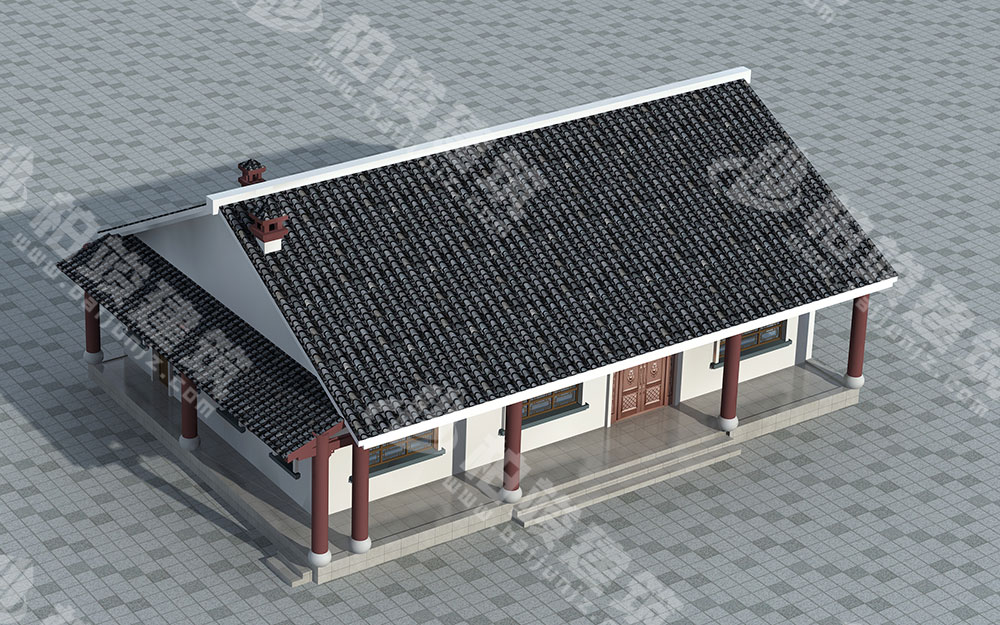 屋顶造型:黛青陶土瓦铺设坡形屋顶,单侧歇山顶荫蔽游廊,造型古朴,宁静悠远